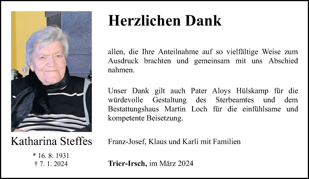 Hier finden Sie alle Traueranzeigen aus der Zeitung, die bisher für Katharina Steffes erschienen sind. Weitere Traueranzeigen, die in der Zeitung erscheinen, werden hier ebenfalls aufgelistet