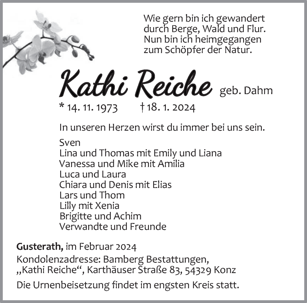 Hier finden Sie alle Traueranzeigen aus der Zeitung, die bisher für Kathi Reiche erschienen sind. Weitere Traueranzeigen, die in der Zeitung erscheinen, werden hier ebenfalls aufgelistet