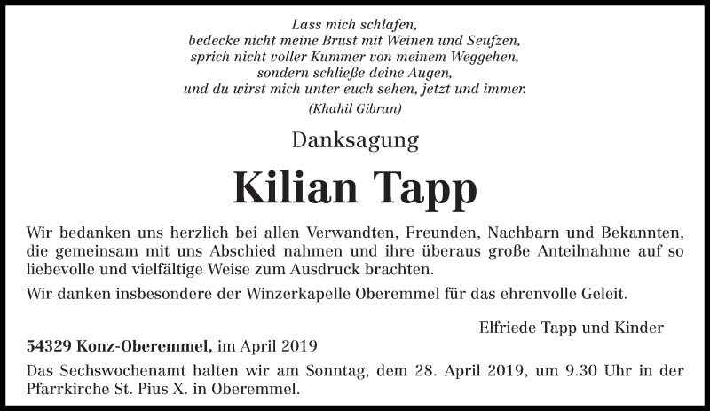 Hier finden Sie alle Traueranzeigen aus der Zeitung, die bisher für Kilian Tapp erschienen sind. Weitere Traueranzeigen, die in der Zeitung erscheinen, werden hier ebenfalls aufgelistet