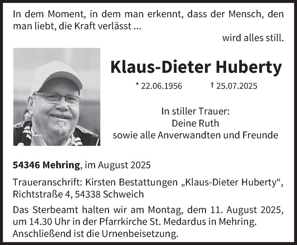 Hier finden Sie alle Traueranzeigen aus der Zeitung, die bisher für Klaus-Dieter Huberty erschienen sind. Weitere Traueranzeigen, die in der Zeitung erscheinen, werden hier ebenfalls aufgelistet