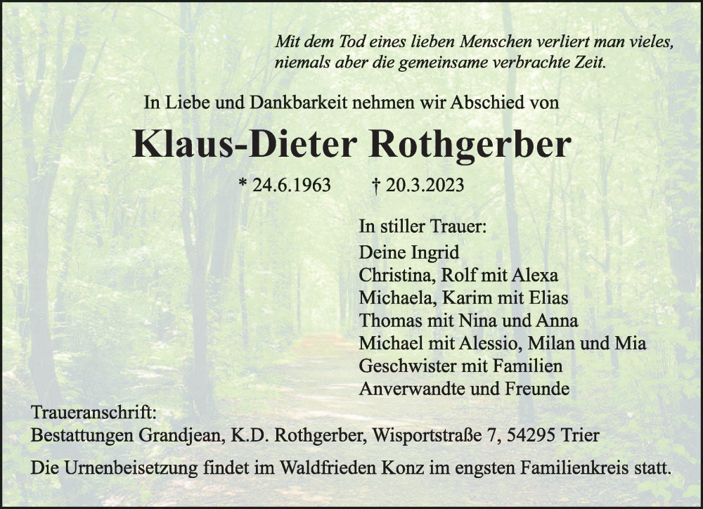 Hier finden Sie alle Traueranzeigen aus der Zeitung, die bisher für Klaus-Dieter Rothgerber erschienen sind. Weitere Traueranzeigen, die in der Zeitung erscheinen, werden hier ebenfalls aufgelistet