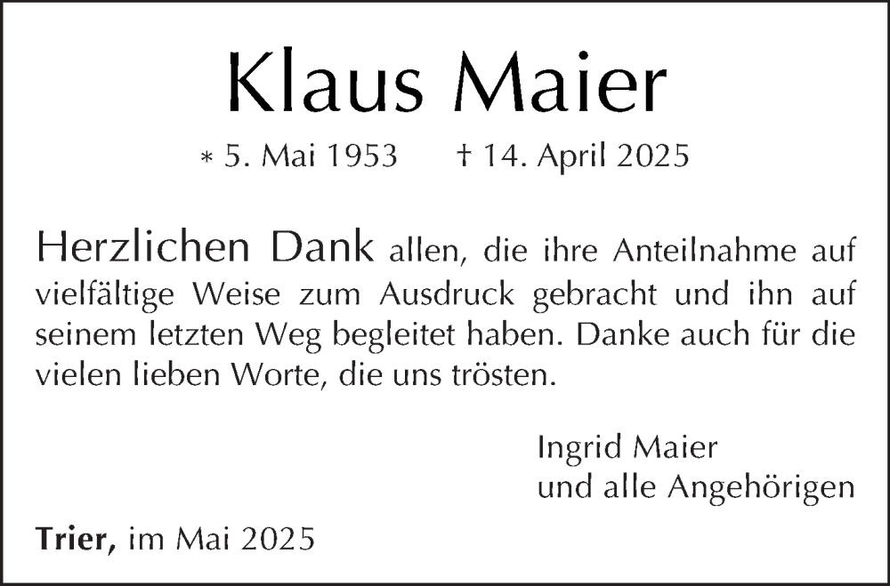 Hier finden Sie alle Traueranzeigen aus der Zeitung, die bisher für Klaus Maier erschienen sind. Weitere Traueranzeigen, die in der Zeitung erscheinen, werden hier ebenfalls aufgelistet