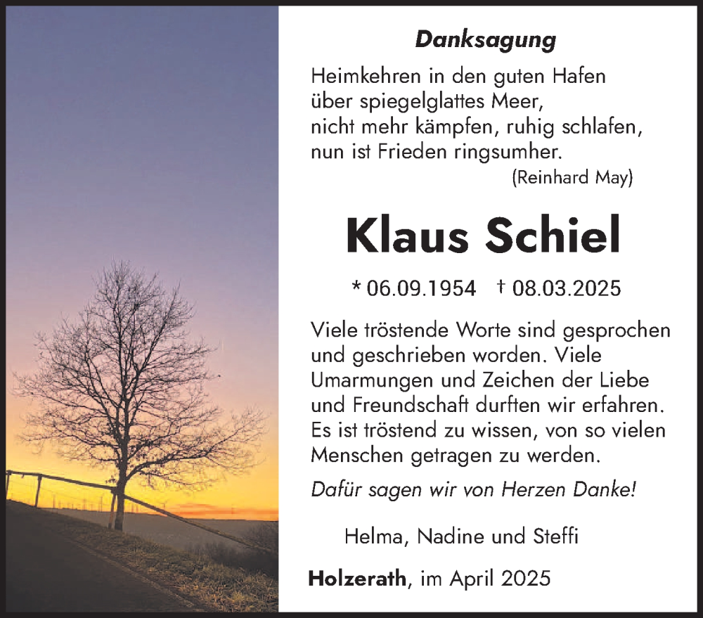 Hier finden Sie alle Traueranzeigen aus der Zeitung, die bisher für Klaus Schiel erschienen sind. Weitere Traueranzeigen, die in der Zeitung erscheinen, werden hier ebenfalls aufgelistet