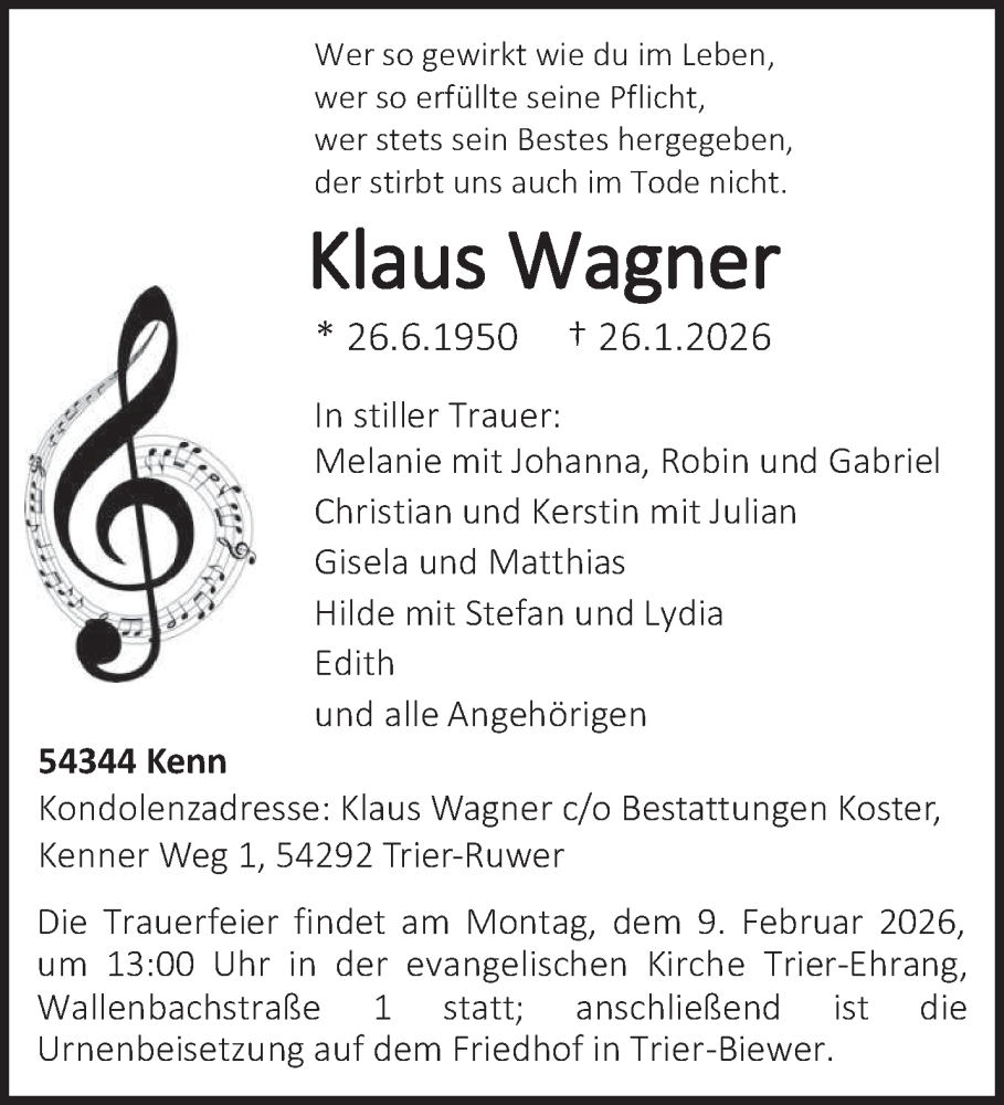 Hier finden Sie alle Traueranzeigen aus der Zeitung, die bisher für Klaus Wagner erschienen sind. Weitere Traueranzeigen, die in der Zeitung erscheinen, werden hier ebenfalls aufgelistet