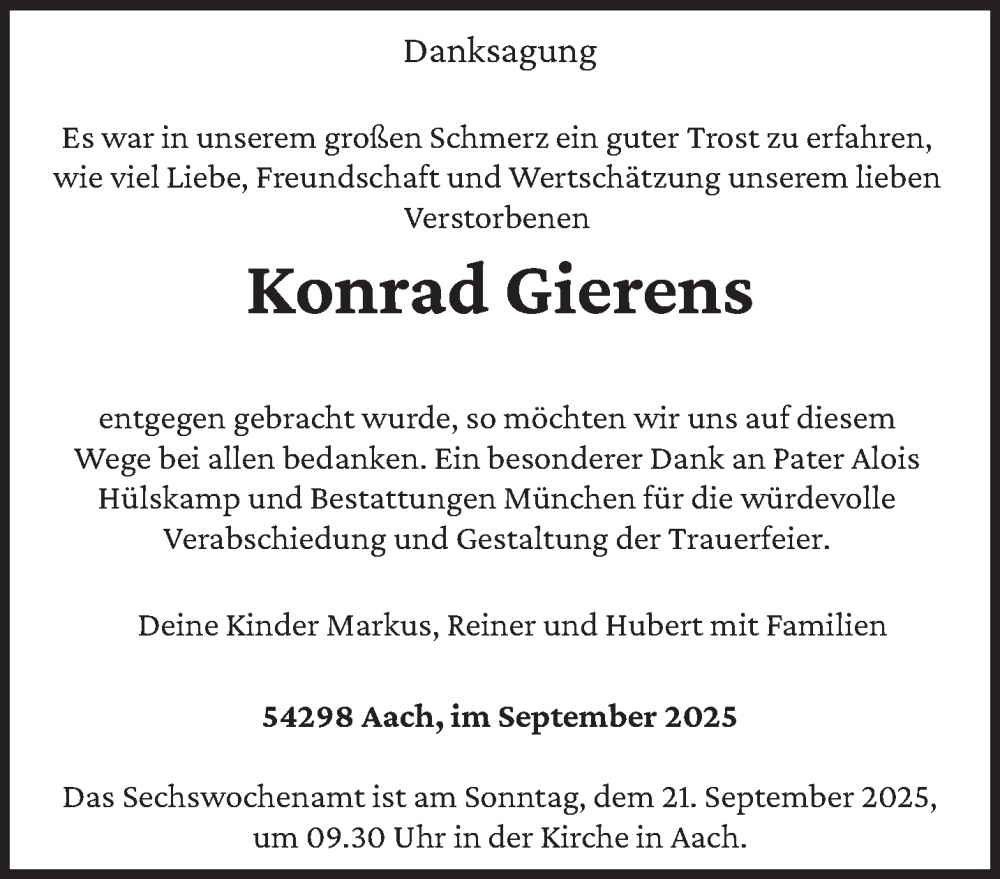 Hier finden Sie alle Traueranzeigen aus der Zeitung, die bisher für Konrad Gierens erschienen sind. Weitere Traueranzeigen, die in der Zeitung erscheinen, werden hier ebenfalls aufgelistet