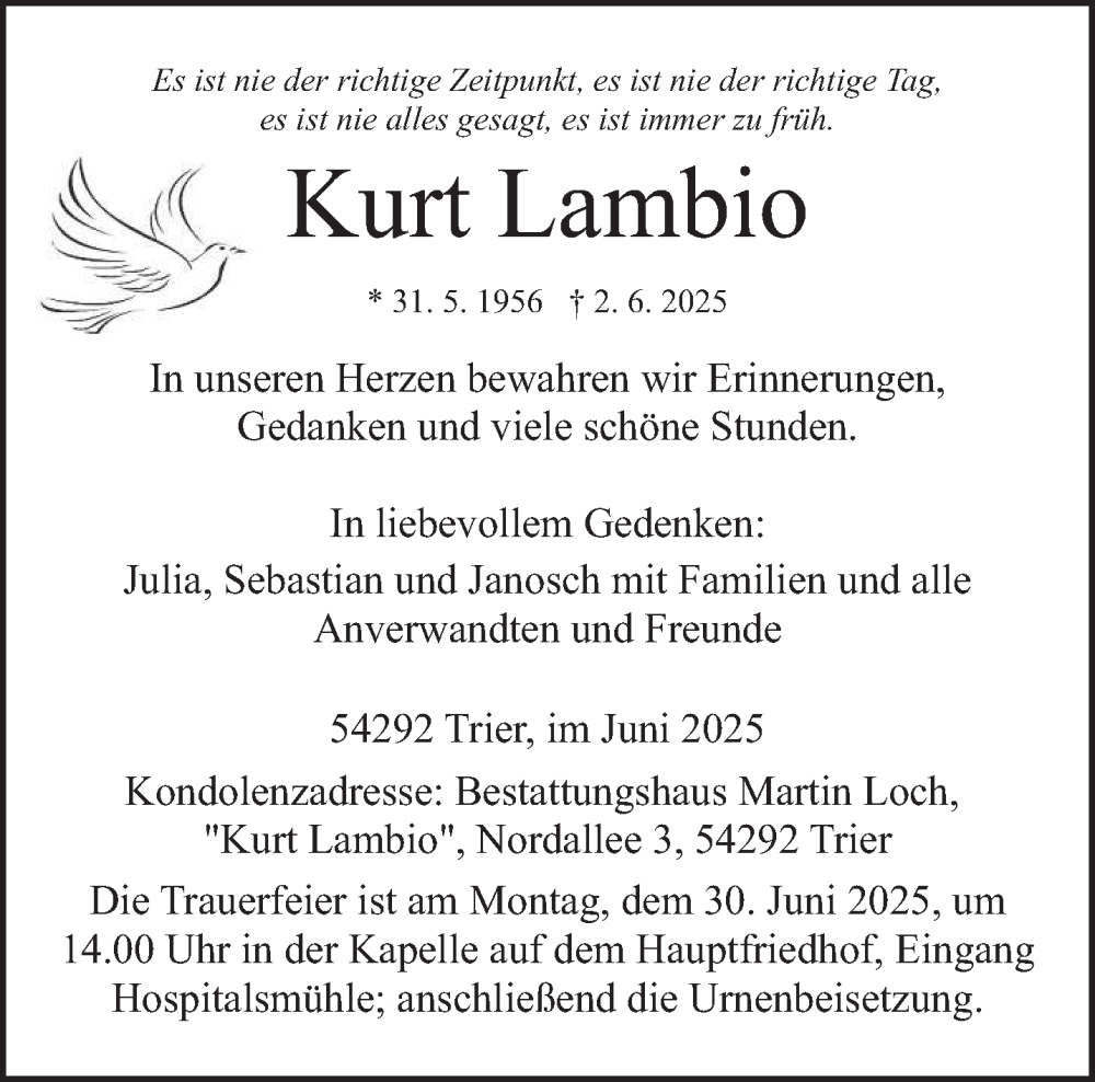 Hier finden Sie alle Traueranzeigen aus der Zeitung, die bisher für Kurt Lambio erschienen sind. Weitere Traueranzeigen, die in der Zeitung erscheinen, werden hier ebenfalls aufgelistet
