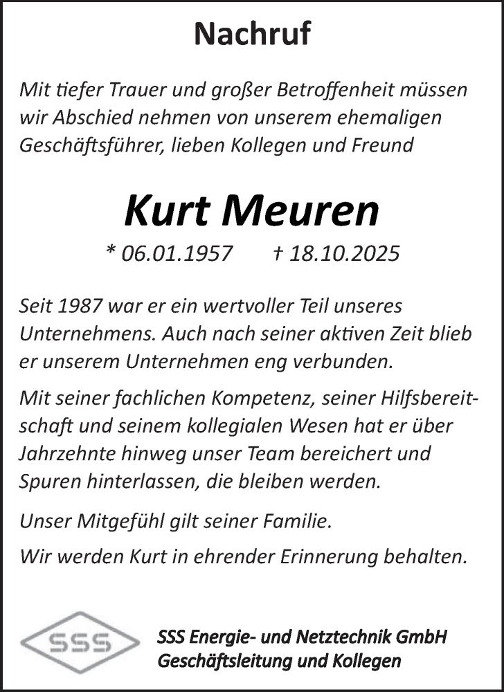 Hier finden Sie alle Traueranzeigen aus der Zeitung, die bisher für Kurt Meuren erschienen sind. Weitere Traueranzeigen, die in der Zeitung erscheinen, werden hier ebenfalls aufgelistet