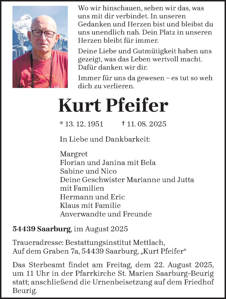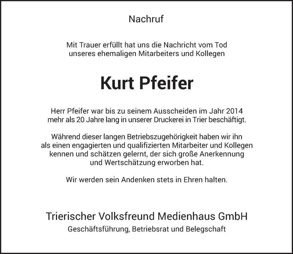 Hier finden Sie alle Traueranzeigen aus der Zeitung, die bisher für Kurt Pfeifer erschienen sind. Weitere Traueranzeigen, die in der Zeitung erscheinen, werden hier ebenfalls aufgelistet