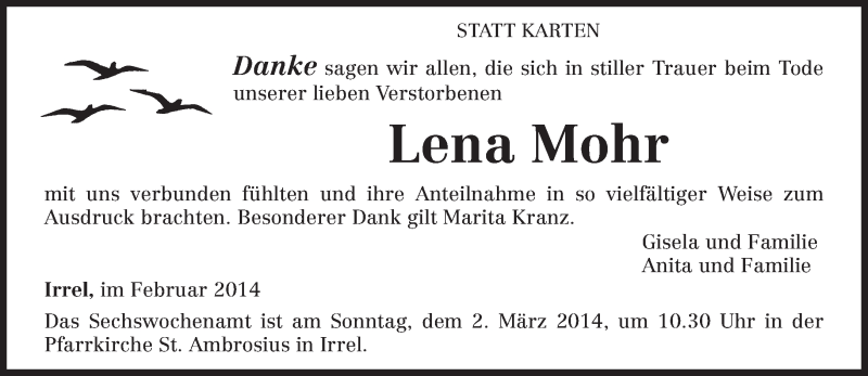 Hier finden Sie alle Traueranzeigen aus der Zeitung, die bisher für Lena Mohr erschienen sind. Weitere Traueranzeigen, die in der Zeitung erscheinen, werden hier ebenfalls aufgelistet