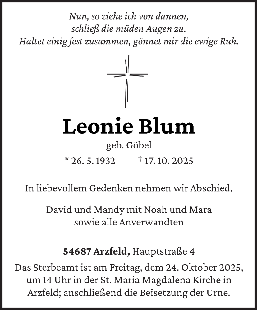 Hier finden Sie alle Traueranzeigen aus der Zeitung, die bisher für Leonie Blum erschienen sind. Weitere Traueranzeigen, die in der Zeitung erscheinen, werden hier ebenfalls aufgelistet