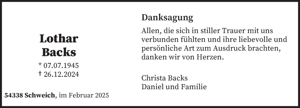 Hier finden Sie alle Traueranzeigen aus der Zeitung, die bisher für Lothar Backs erschienen sind. Weitere Traueranzeigen, die in der Zeitung erscheinen, werden hier ebenfalls aufgelistet