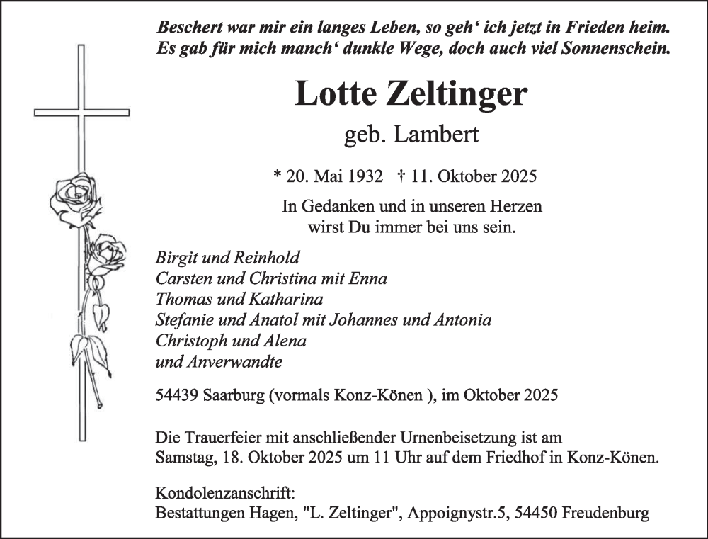 Hier finden Sie alle Traueranzeigen aus der Zeitung, die bisher für Lotte Zeltinger erschienen sind. Weitere Traueranzeigen, die in der Zeitung erscheinen, werden hier ebenfalls aufgelistet