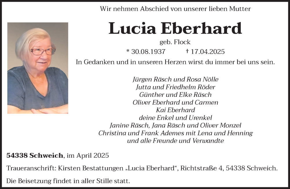 Hier finden Sie alle Traueranzeigen aus der Zeitung, die bisher für Lucia Eberhard erschienen sind. Weitere Traueranzeigen, die in der Zeitung erscheinen, werden hier ebenfalls aufgelistet
