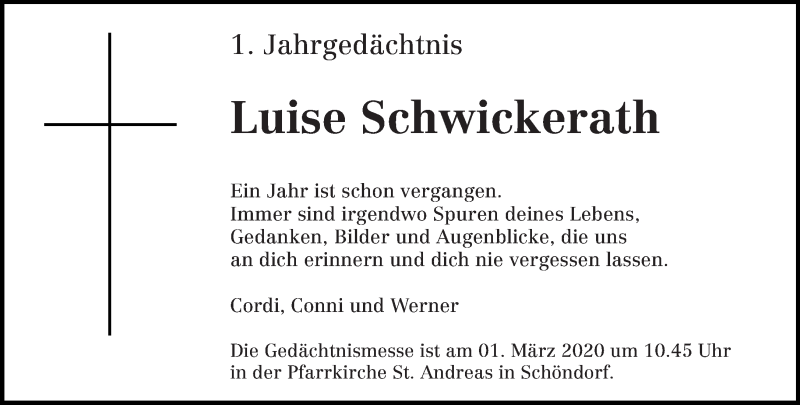 Hier finden Sie alle Traueranzeigen aus der Zeitung, die bisher für Luise Schwickerath erschienen sind. Weitere Traueranzeigen, die in der Zeitung erscheinen, werden hier ebenfalls aufgelistet