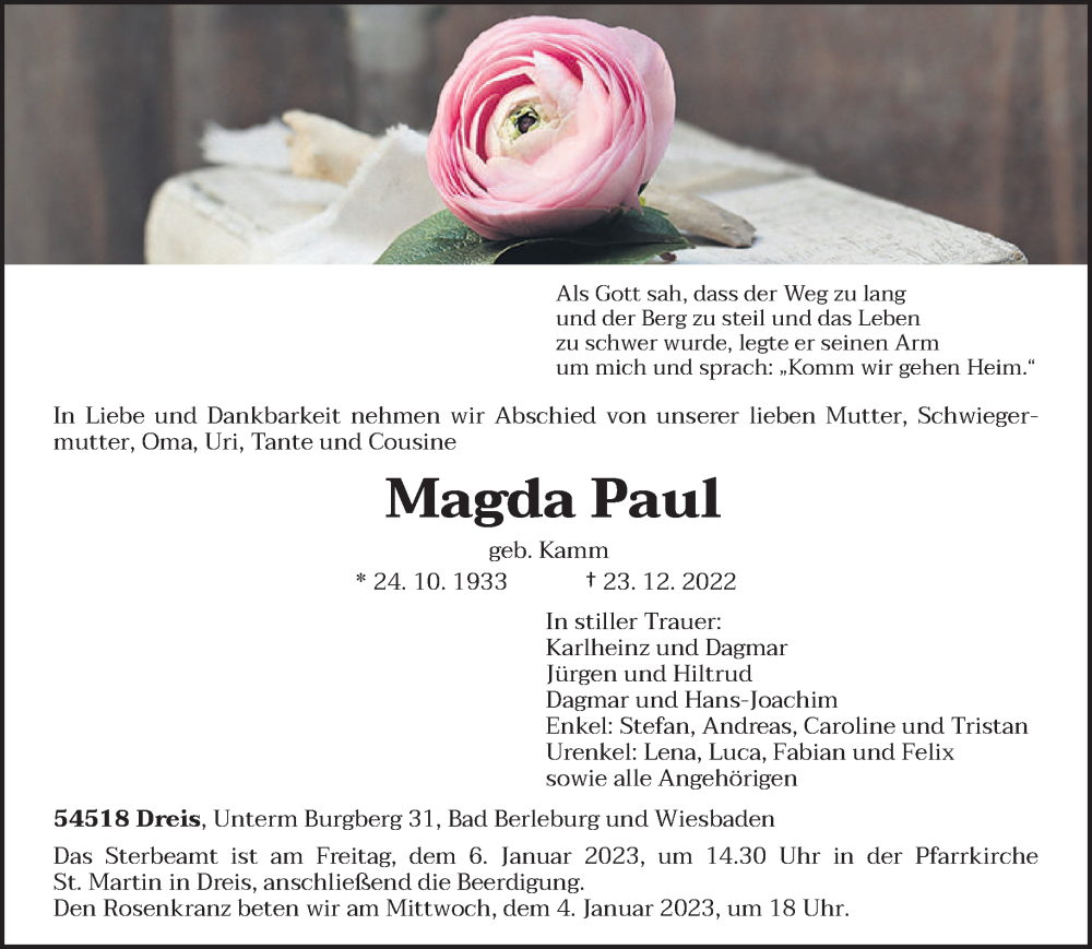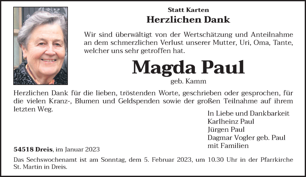 Hier finden Sie alle Traueranzeigen aus der Zeitung, die bisher für Magda Paul erschienen sind. Weitere Traueranzeigen, die in der Zeitung erscheinen, werden hier ebenfalls aufgelistet