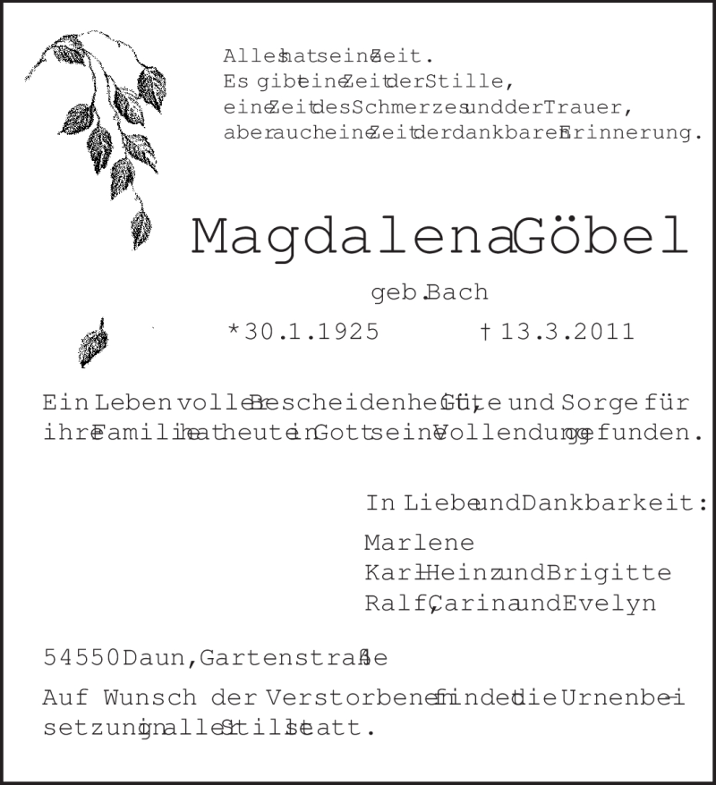 Hier finden Sie alle Traueranzeigen aus der Zeitung, die bisher für Magdalena Göbel erschienen sind. Weitere Traueranzeigen, die in der Zeitung erscheinen, werden hier ebenfalls aufgelistet