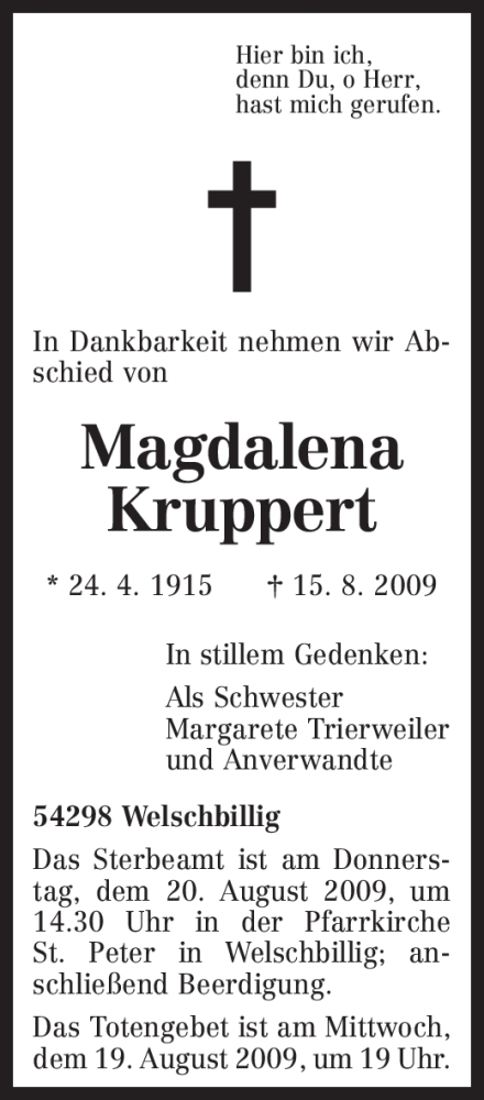Hier finden Sie alle Traueranzeigen aus der Zeitung, die bisher für Magdalena Kruppert erschienen sind. Weitere Traueranzeigen, die in der Zeitung erscheinen, werden hier ebenfalls aufgelistet