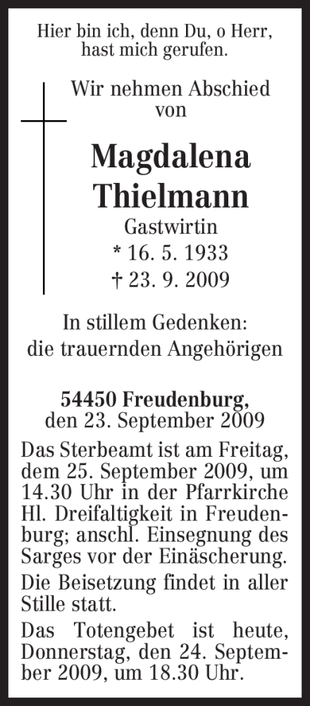 Hier finden Sie alle Traueranzeigen aus der Zeitung, die bisher für Magdalena Thielmann erschienen sind. Weitere Traueranzeigen, die in der Zeitung erscheinen, werden hier ebenfalls aufgelistet