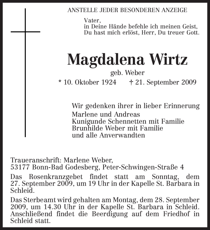 Hier finden Sie alle Traueranzeigen aus der Zeitung, die bisher für Magdalena Wirtz erschienen sind. Weitere Traueranzeigen, die in der Zeitung erscheinen, werden hier ebenfalls aufgelistet