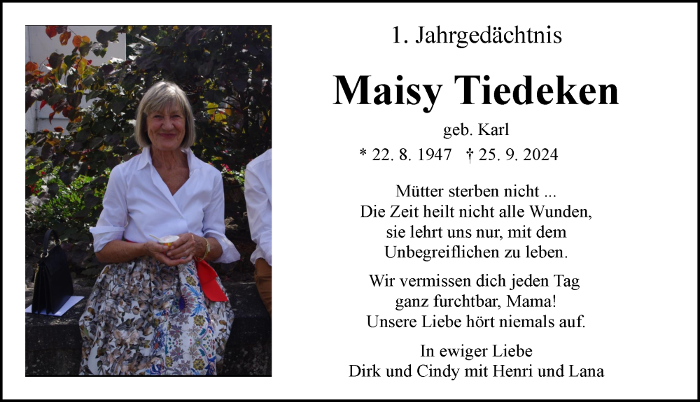 Hier finden Sie alle Traueranzeigen aus der Zeitung, die bisher für Maisy Tiedeken erschienen sind. Weitere Traueranzeigen, die in der Zeitung erscheinen, werden hier ebenfalls aufgelistet