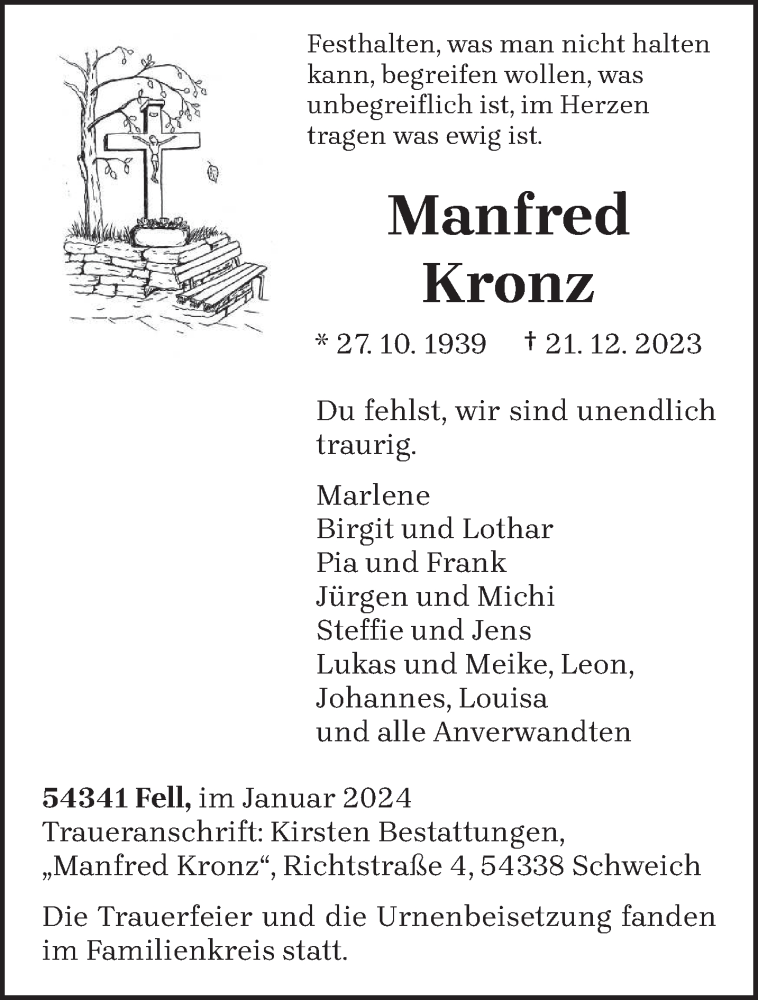 Hier finden Sie alle Traueranzeigen aus der Zeitung, die bisher für Manfred Kronz erschienen sind. Weitere Traueranzeigen, die in der Zeitung erscheinen, werden hier ebenfalls aufgelistet