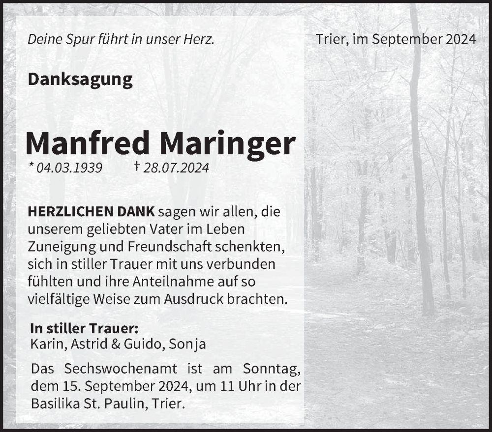 Hier finden Sie alle Traueranzeigen aus der Zeitung, die bisher für Manfred Maringer erschienen sind. Weitere Traueranzeigen, die in der Zeitung erscheinen, werden hier ebenfalls aufgelistet