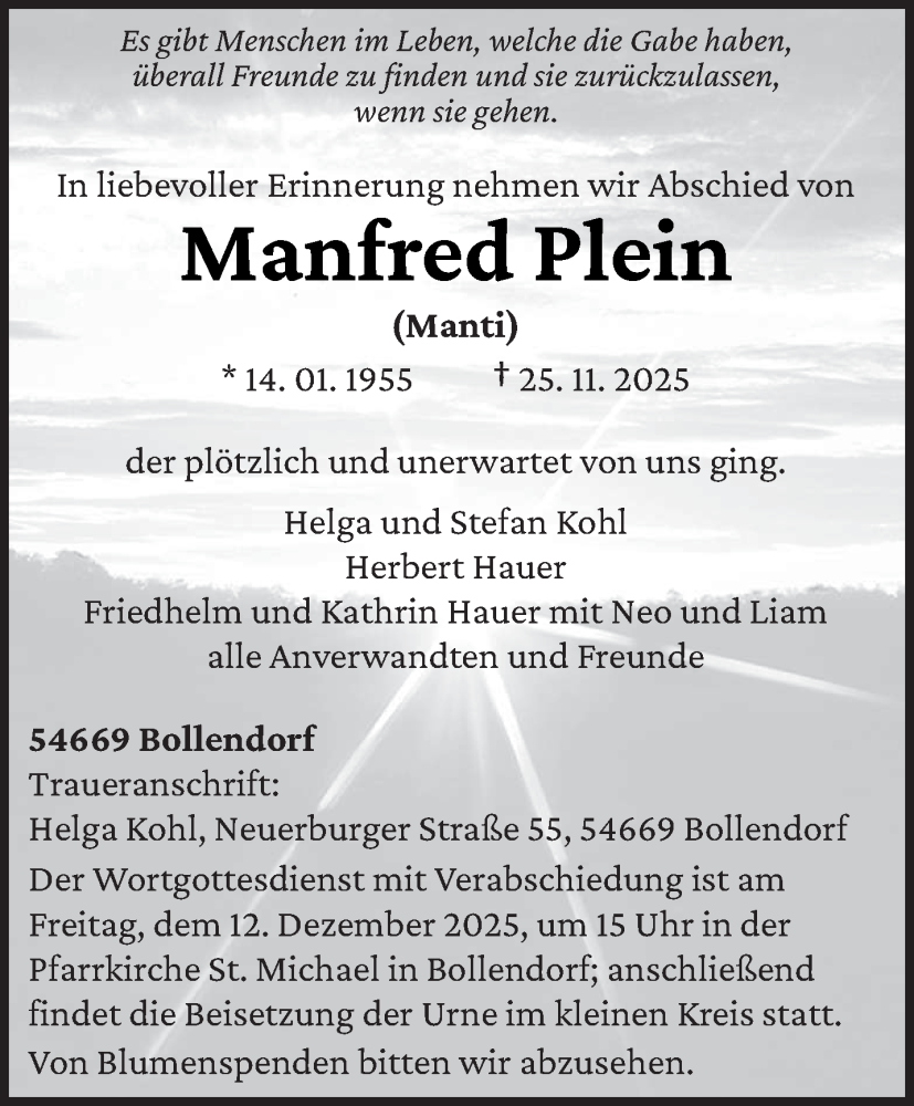 Hier finden Sie alle Traueranzeigen aus der Zeitung, die bisher für Manfred Plein erschienen sind. Weitere Traueranzeigen, die in der Zeitung erscheinen, werden hier ebenfalls aufgelistet
