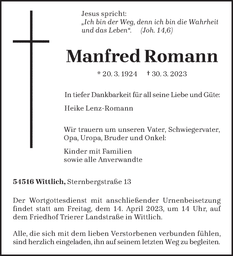 Hier finden Sie alle Traueranzeigen aus der Zeitung, die bisher für Manfred Romann erschienen sind. Weitere Traueranzeigen, die in der Zeitung erscheinen, werden hier ebenfalls aufgelistet
