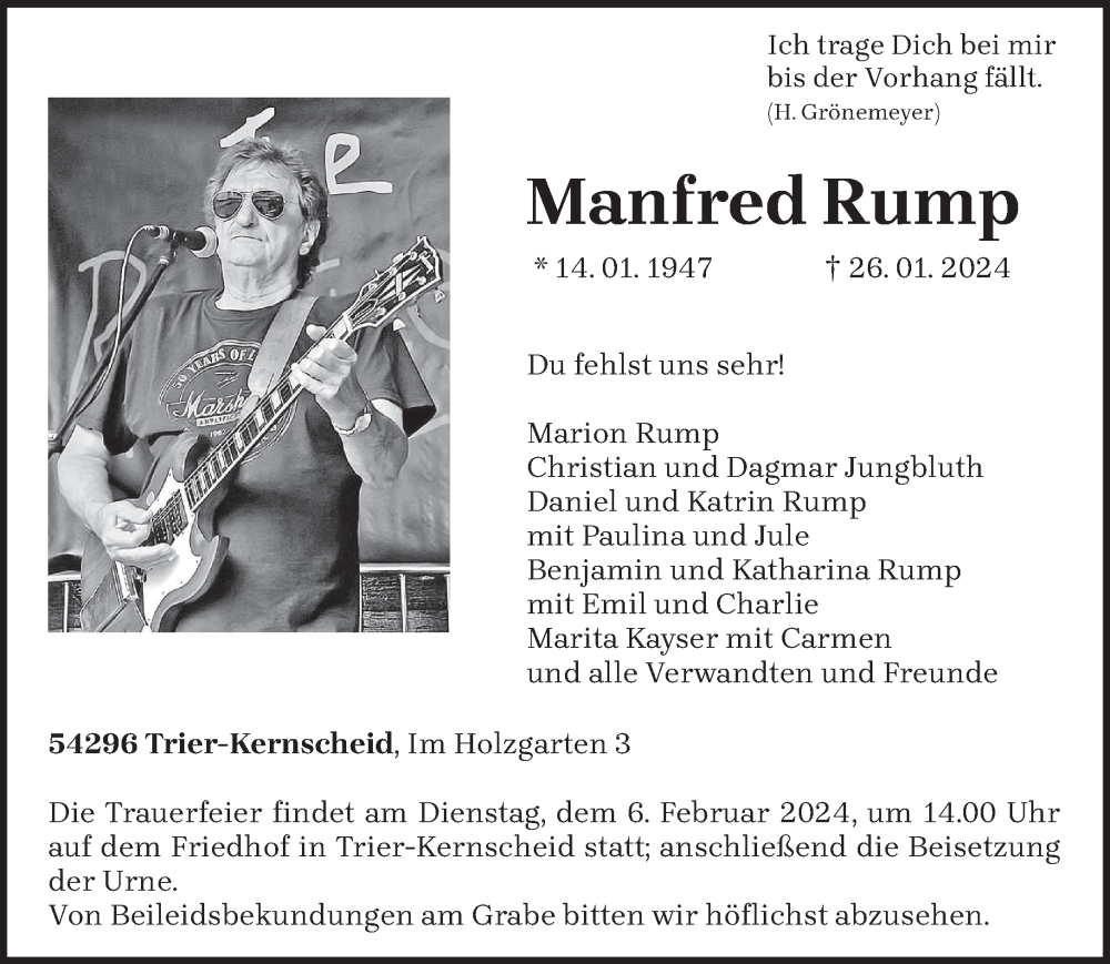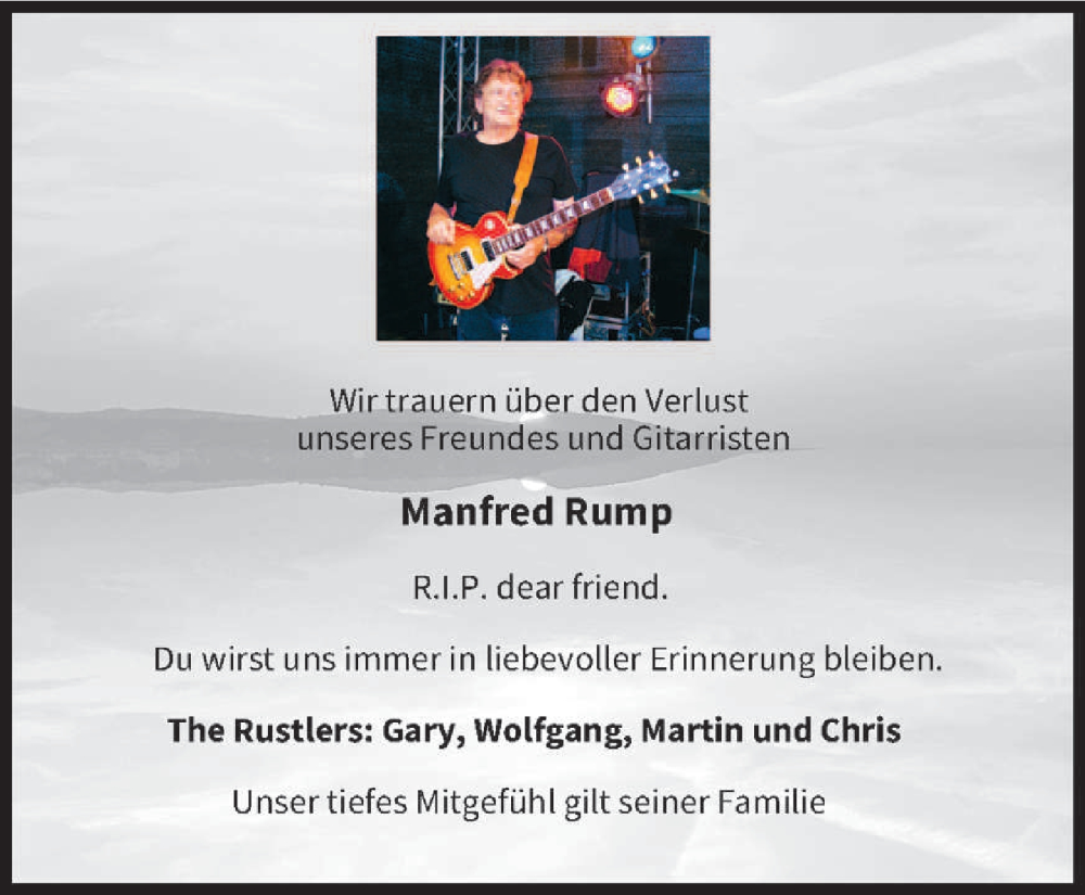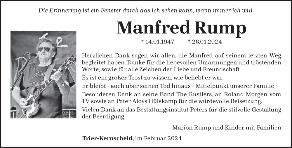 Hier finden Sie alle Traueranzeigen aus der Zeitung, die bisher für Manfred Rump erschienen sind. Weitere Traueranzeigen, die in der Zeitung erscheinen, werden hier ebenfalls aufgelistet