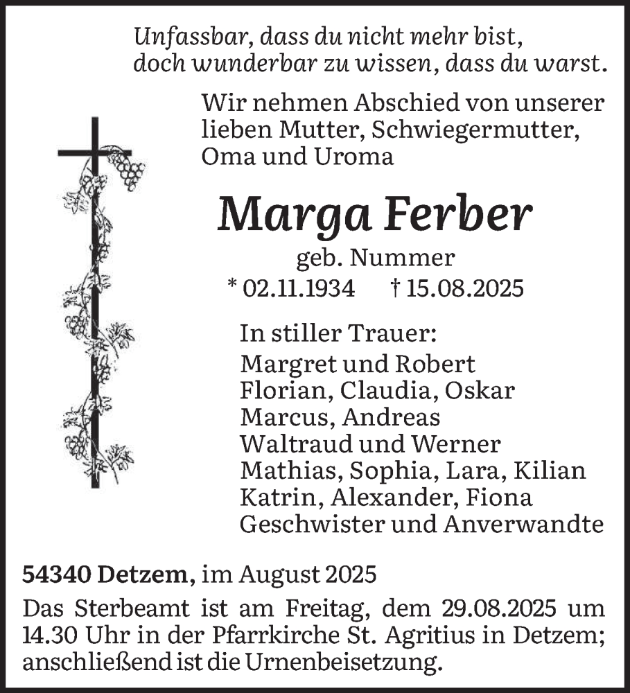 Hier finden Sie alle Traueranzeigen aus der Zeitung, die bisher für Marga Ferber erschienen sind. Weitere Traueranzeigen, die in der Zeitung erscheinen, werden hier ebenfalls aufgelistet