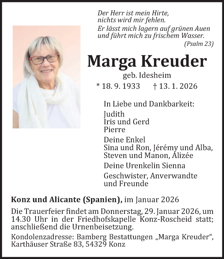 Hier finden Sie alle Traueranzeigen aus der Zeitung, die bisher für Marga Kreuder erschienen sind. Weitere Traueranzeigen, die in der Zeitung erscheinen, werden hier ebenfalls aufgelistet