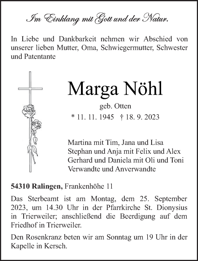 Hier finden Sie alle Traueranzeigen aus der Zeitung, die bisher für Marga Nöhl erschienen sind. Weitere Traueranzeigen, die in der Zeitung erscheinen, werden hier ebenfalls aufgelistet