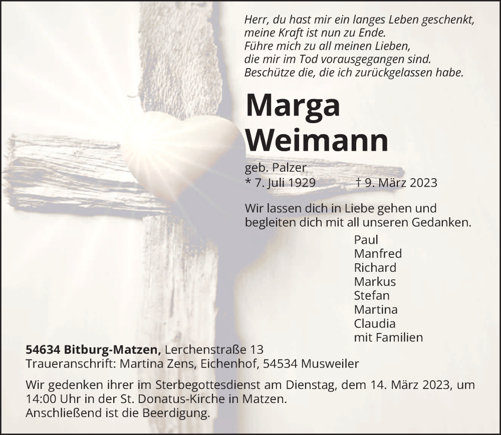 Hier finden Sie alle Traueranzeigen aus der Zeitung, die bisher für Marga Weimann erschienen sind. Weitere Traueranzeigen, die in der Zeitung erscheinen, werden hier ebenfalls aufgelistet