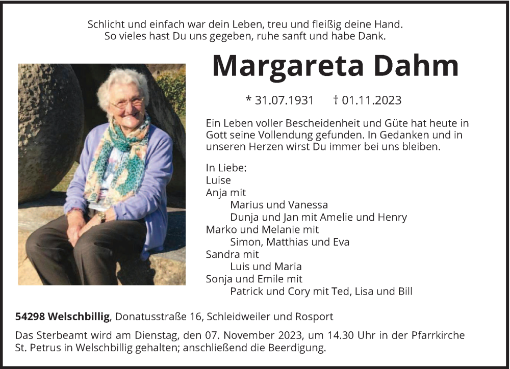 Hier finden Sie alle Traueranzeigen aus der Zeitung, die bisher für Margareta Dahm erschienen sind. Weitere Traueranzeigen, die in der Zeitung erscheinen, werden hier ebenfalls aufgelistet