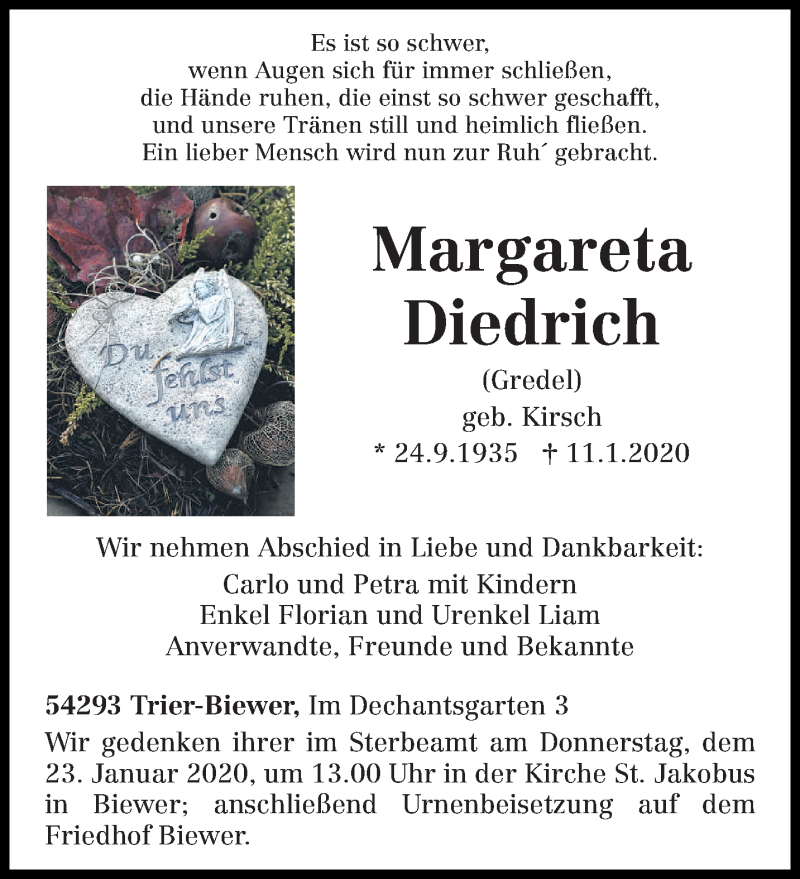 Hier finden Sie alle Traueranzeigen aus der Zeitung, die bisher für Margareta Diedrich erschienen sind. Weitere Traueranzeigen, die in der Zeitung erscheinen, werden hier ebenfalls aufgelistet