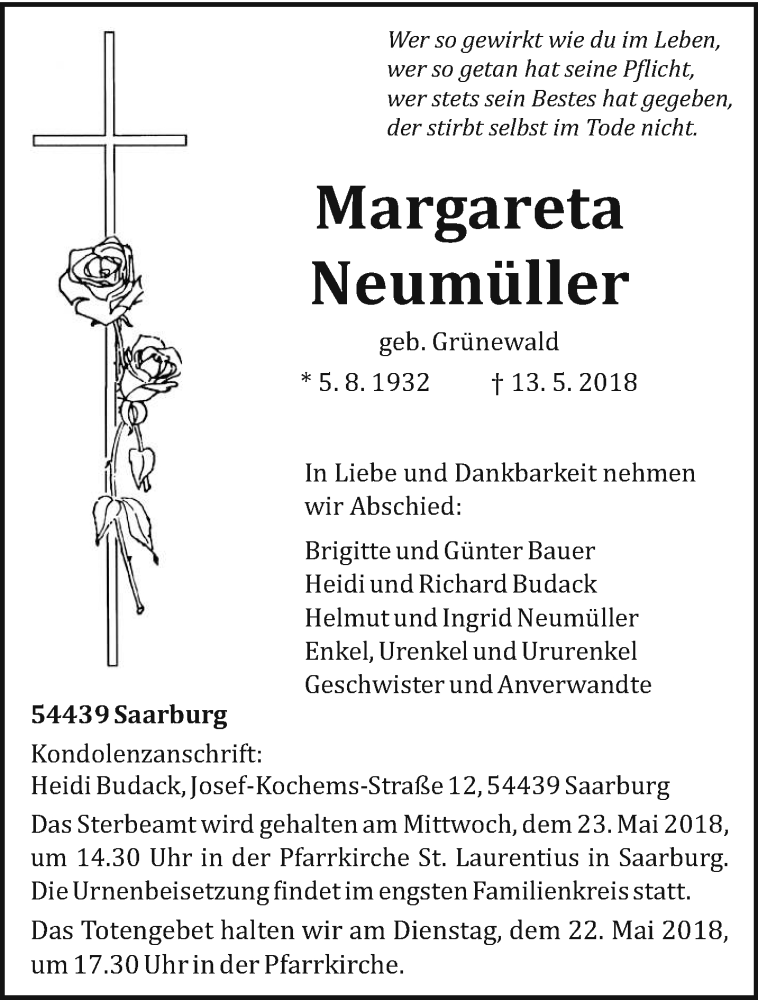 Hier finden Sie alle Traueranzeigen aus der Zeitung, die bisher für Margareta Neumüller erschienen sind. Weitere Traueranzeigen, die in der Zeitung erscheinen, werden hier ebenfalls aufgelistet