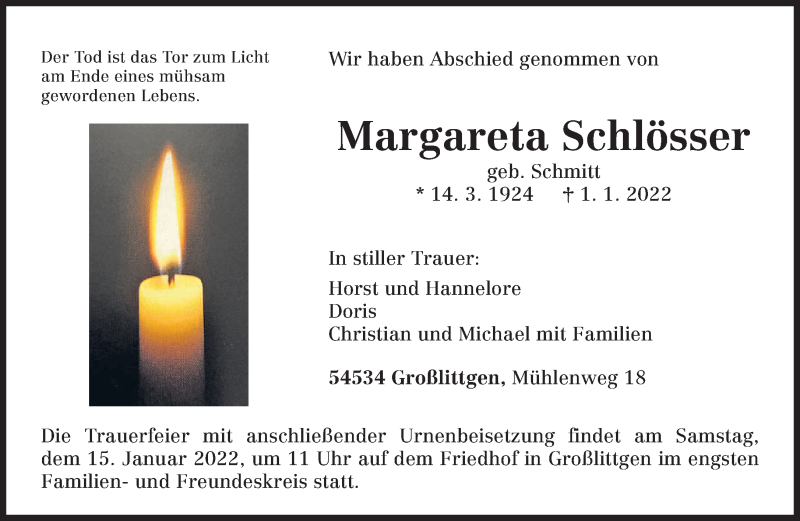 Hier finden Sie alle Traueranzeigen aus der Zeitung, die bisher für Margareta Schlösser erschienen sind. Weitere Traueranzeigen, die in der Zeitung erscheinen, werden hier ebenfalls aufgelistet