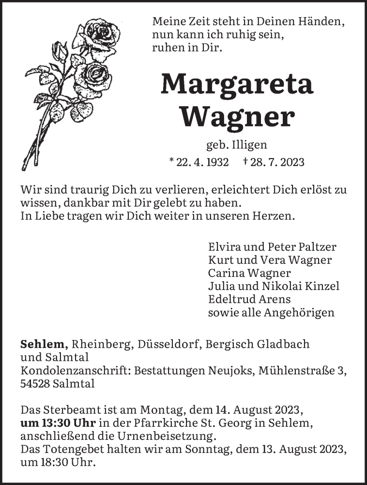Hier finden Sie alle Traueranzeigen aus der Zeitung, die bisher für Margareta Wagner erschienen sind. Weitere Traueranzeigen, die in der Zeitung erscheinen, werden hier ebenfalls aufgelistet