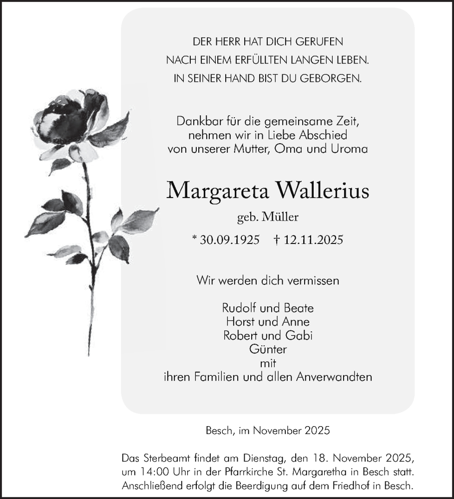 Hier finden Sie alle Traueranzeigen aus der Zeitung, die bisher für Margareta Wallerius erschienen sind. Weitere Traueranzeigen, die in der Zeitung erscheinen, werden hier ebenfalls aufgelistet