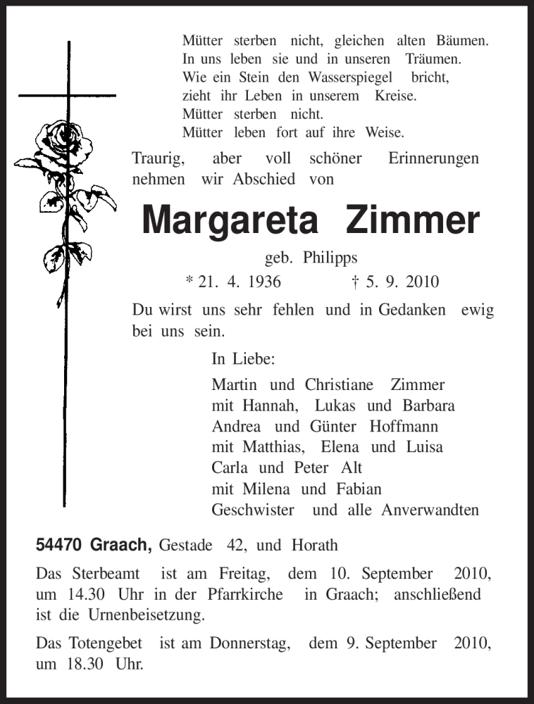 Hier finden Sie alle Traueranzeigen aus der Zeitung, die bisher für Margareta Zimmer erschienen sind. Weitere Traueranzeigen, die in der Zeitung erscheinen, werden hier ebenfalls aufgelistet