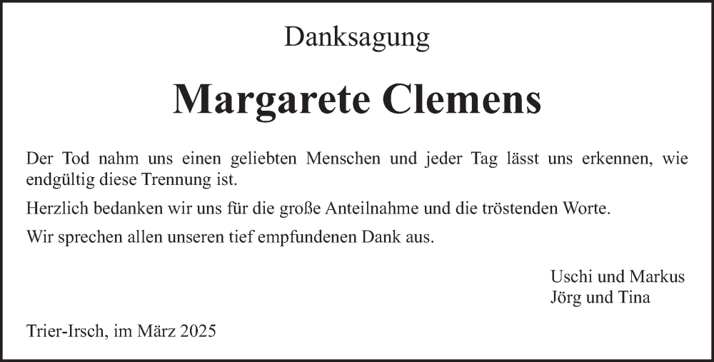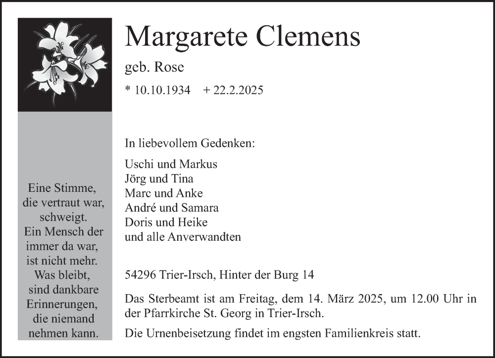 Hier finden Sie alle Traueranzeigen aus der Zeitung, die bisher für Margarete Clemens erschienen sind. Weitere Traueranzeigen, die in der Zeitung erscheinen, werden hier ebenfalls aufgelistet