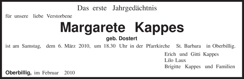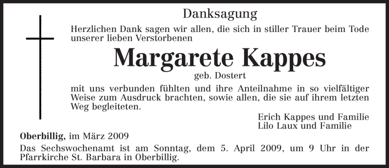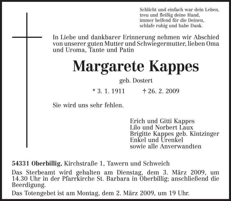 Hier finden Sie alle Traueranzeigen aus der Zeitung, die bisher für Margarete Kappes erschienen sind. Weitere Traueranzeigen, die in der Zeitung erscheinen, werden hier ebenfalls aufgelistet
