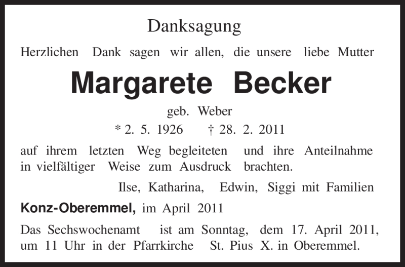 Hier finden Sie alle Traueranzeigen aus der Zeitung, die bisher für Margarte Becker erschienen sind. Weitere Traueranzeigen, die in der Zeitung erscheinen, werden hier ebenfalls aufgelistet