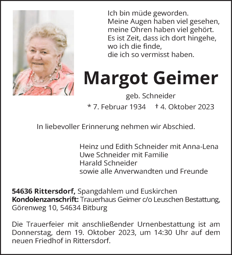 Hier finden Sie alle Traueranzeigen aus der Zeitung, die bisher für Margot Geimer erschienen sind. Weitere Traueranzeigen, die in der Zeitung erscheinen, werden hier ebenfalls aufgelistet