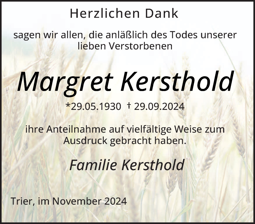 Hier finden Sie alle Traueranzeigen aus der Zeitung, die bisher für Margret Kersthold erschienen sind. Weitere Traueranzeigen, die in der Zeitung erscheinen, werden hier ebenfalls aufgelistet