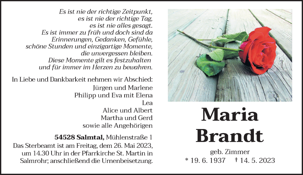 Hier finden Sie alle Traueranzeigen aus der Zeitung, die bisher für Maria Brandt erschienen sind. Weitere Traueranzeigen, die in der Zeitung erscheinen, werden hier ebenfalls aufgelistet