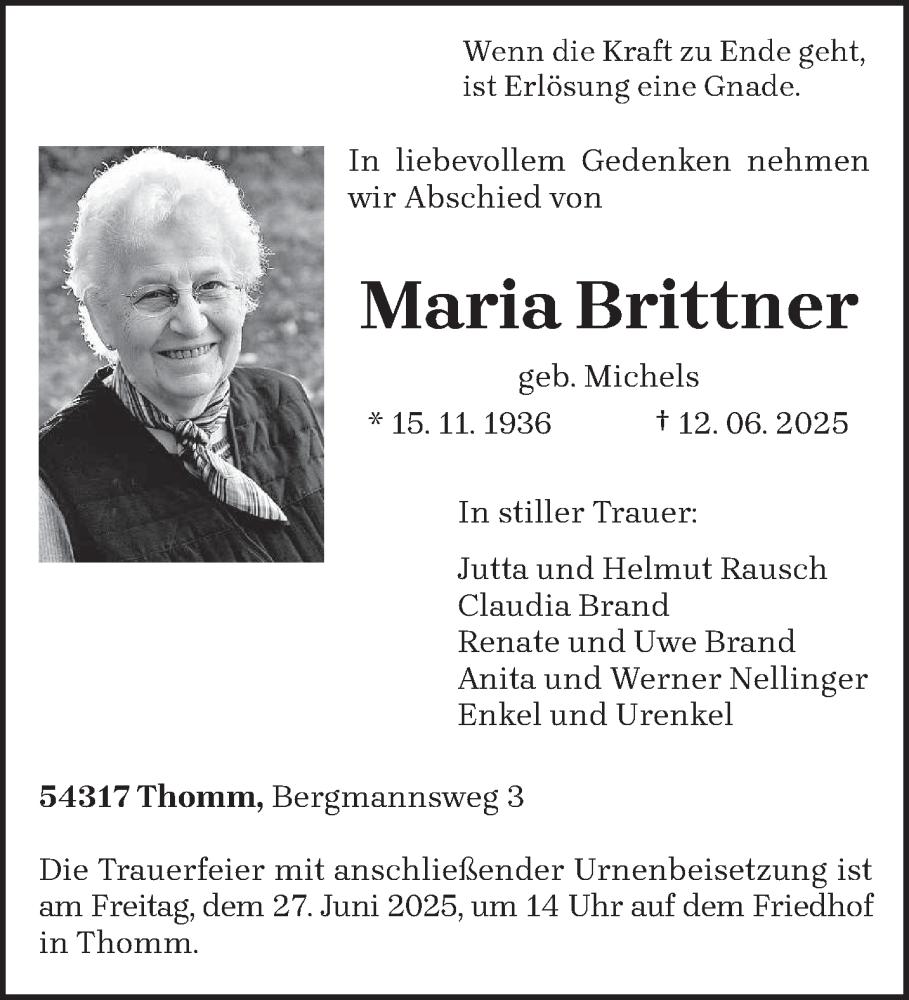Hier finden Sie alle Traueranzeigen aus der Zeitung, die bisher für Maria Brittner erschienen sind. Weitere Traueranzeigen, die in der Zeitung erscheinen, werden hier ebenfalls aufgelistet