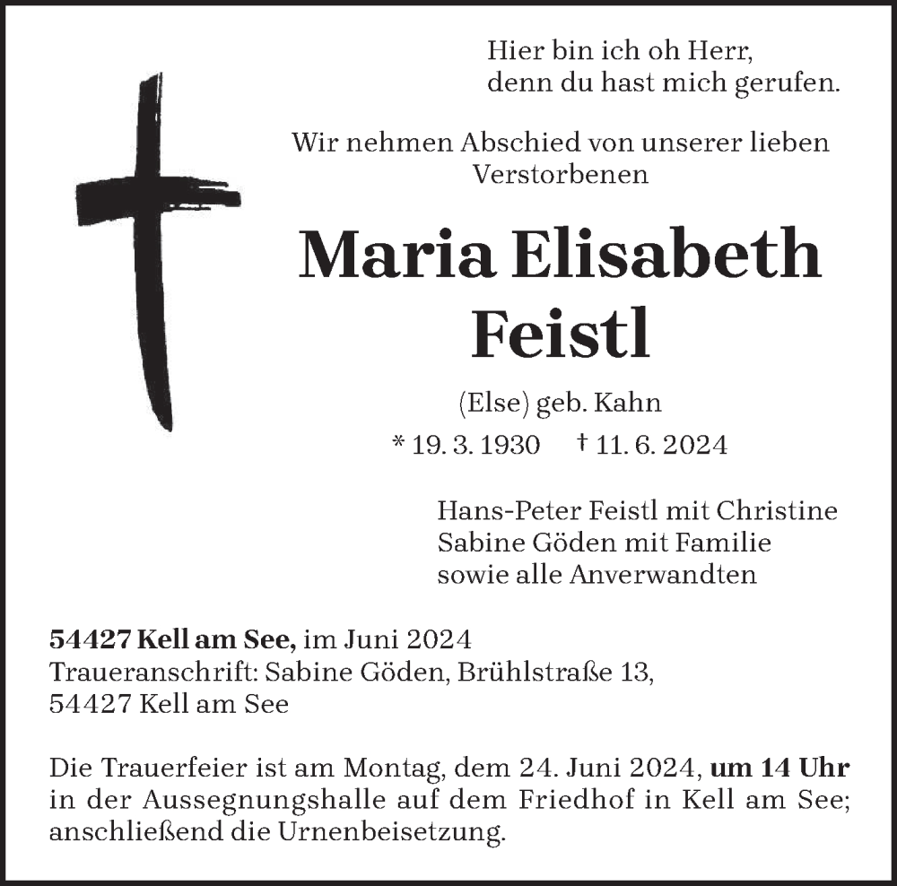 Hier finden Sie alle Traueranzeigen aus der Zeitung, die bisher für Maria Elisabeth Feistl erschienen sind. Weitere Traueranzeigen, die in der Zeitung erscheinen, werden hier ebenfalls aufgelistet