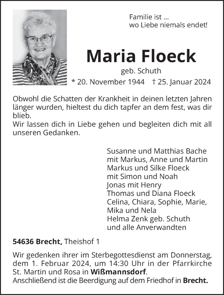 Hier finden Sie alle Traueranzeigen aus der Zeitung, die bisher für Maria Floeck erschienen sind. Weitere Traueranzeigen, die in der Zeitung erscheinen, werden hier ebenfalls aufgelistet