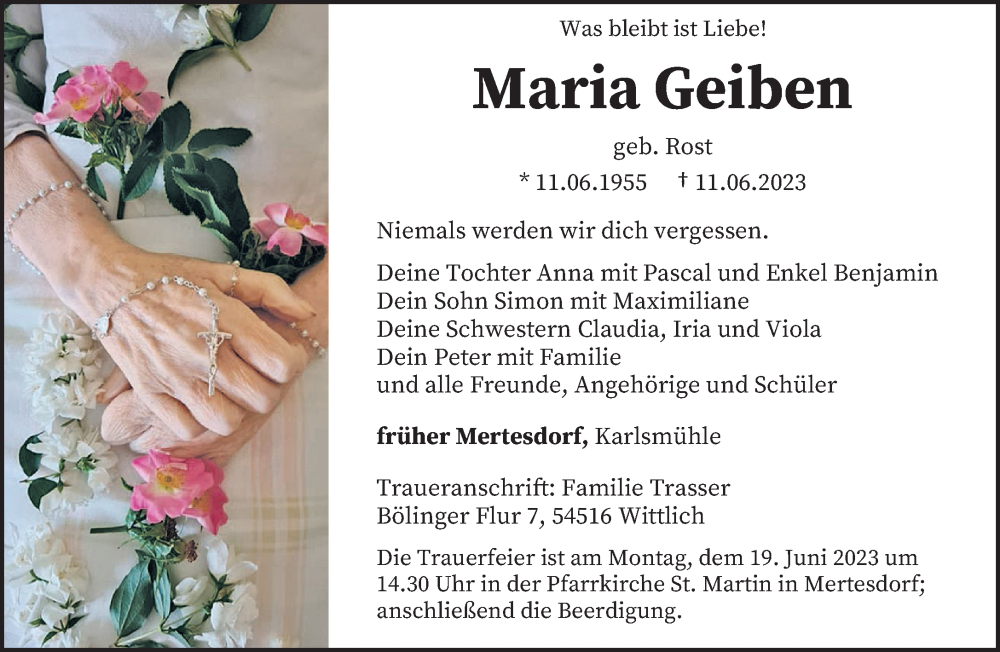 Hier finden Sie alle Traueranzeigen aus der Zeitung, die bisher für Maria Geiben erschienen sind. Weitere Traueranzeigen, die in der Zeitung erscheinen, werden hier ebenfalls aufgelistet